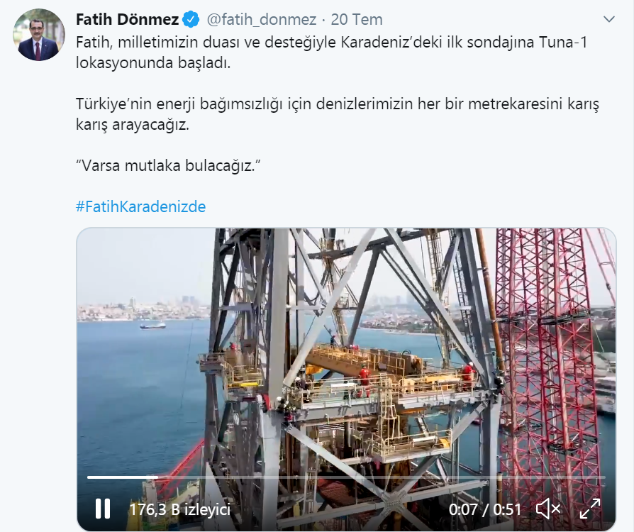 Enerji ve Tabii Kaynaklar Bakanı Fatih Dönmez, Twitter hesabından yaptığı paylaşımda, Fatih sondaj gemisinin Karadeniz’deki ilk sondajına Tuna-1 lokasyonunda başladığını belirterek, “Varsa mutlaka bulacağız” dedi.