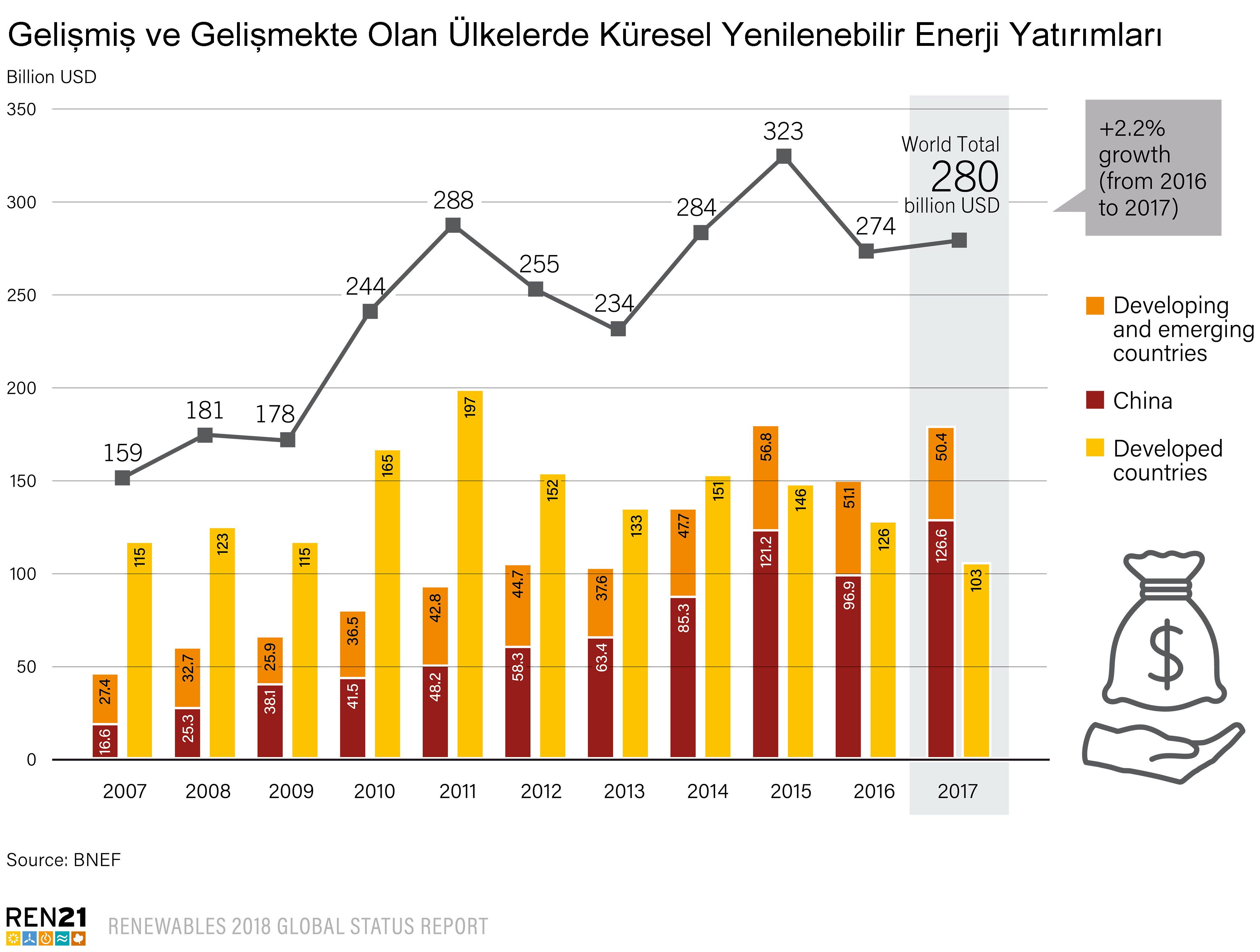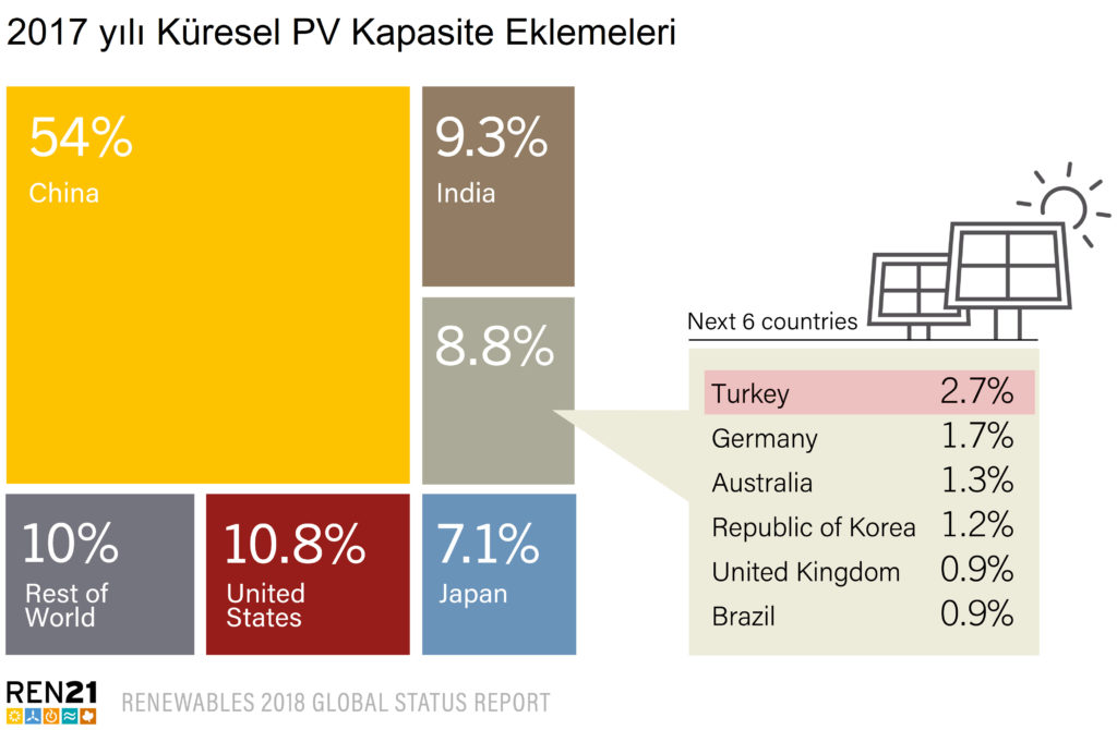 Yenilenebilir enerji ve yakıtlara yapılan küresel yeni yatırım 2017 yılında 279,8 milyar ABD Doları’na ulaştı. Küresel fotovoltaik kapasitesi eklemelerinde yüzde 54 ile en büyük pay Çin’in olurken katkıda bulunan 10 ülkeden biri yüzde 2,7’lik payı ile Türkiye oldu.