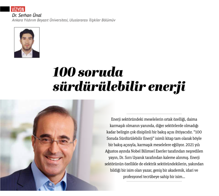 Enerji sektöründeki meselelerin ortak özelliği, daima karmaşık olmanın yanında, diğer sektörlerde olmadığı kadar belirgin çok disiplinli bir bakış açısı ihtiyacıdır. “100 Soruda Sürdürülebilir Enerji” isimli kitap tam olarak böyle bir bakış açısıyla, karmaşık meselelere eğiliyor. 2021 yılı Ağustos ayında Nobel Bilimsel Eserler tarafından neşredilen yayın, Dr. Sırrı Uyanık tarafından kaleme alınmış. Enerji sektörünün özellikle de elektrik sektöründekilerin, yakından bildiği bir isim olan yazar, geniş bir akademik, idari ve profesyonel tecrübeye sahip bir isim…
