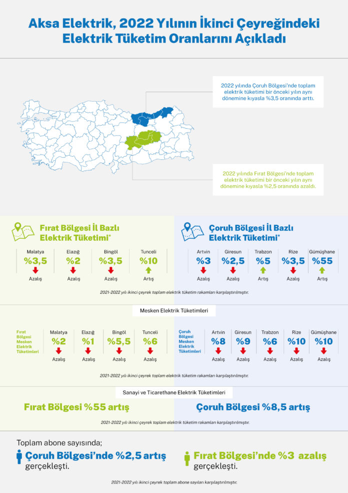 Aksa Elektrik’ten yapılan açıklamada, Fırat bölgesindeki illere mesken, sanayi ve ticarethane abone grupları dahil edilerek bakıldığında, yılın ikinci çeyreğinde, bir önceki yılın aynı dönemine göre, toplam elektrik tüketiminin Tunceli’de yaklaşık yüzde 10 oranında arttığı görülürken Çoruh bölgesine bağlı Gümüşhane’de yaklaşık yüzde 55 ve Trabzon’da ise yaklaşık yüzde 5 oranlarında arttığı belirtildi.
