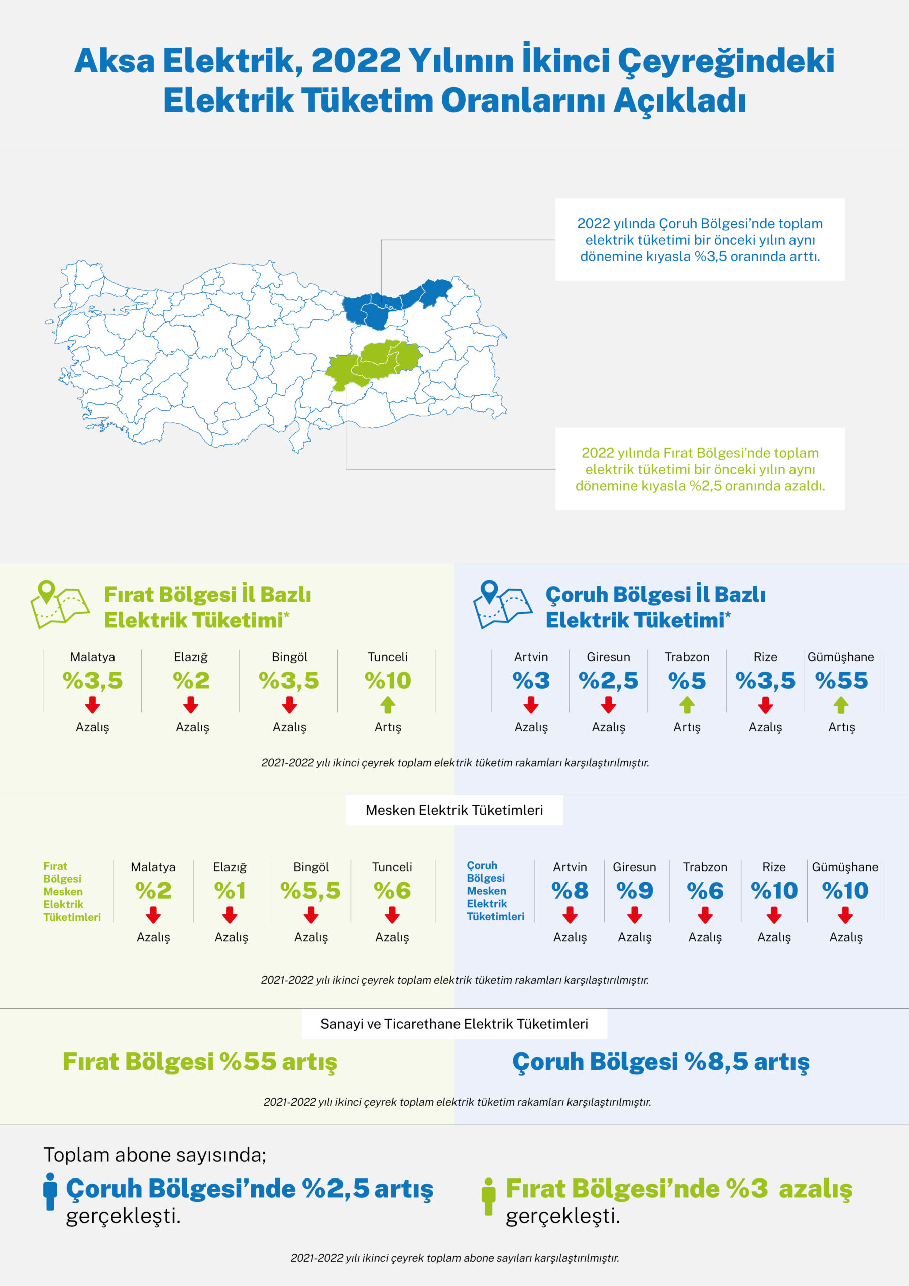 Aksa Elektrik, 2022 yılı nisan, mayıs, haziran dönemlerine ait elektrik tüketim oranlarını açıkladı. Şirketten yapılan açıklamaya göre, Fırat bölgesinin toplam elektrik tüketimi bir önceki yılın aynı dönemine göre düşerken Çoruh bölgesinin toplam elektrik tüketimi arttı.