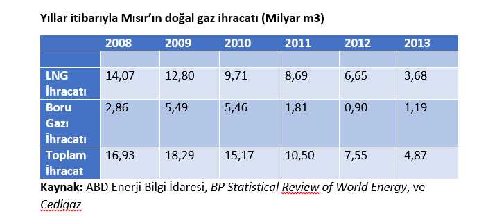 Mısır, yakın zamana kadar doğal gaz ihraç eden bir ülke konumundaydı ancak gerek Arap Baharı ile birlikte ülkede yaşanan gelişmeler gerek düşen üretim miktarı ve artan iç talep nedeniyle doğal gaz ihracatı önemli oranda azaldı. Hatta 2015 yılında iç tüketimi desteklemek üzere LNG ithalatına başladı. Uzun bir süre, önemli bir bölümü Avrupa Birliği ve Asya ülkelerine olmak üzere LNG, Ürdün, Suriye ve İsrail’e de boru hattı üzerinden doğal gaz ihracatı yapan Mısır’da hali hazırda önemli bir kapasite ile faaliyet gösterebilecek doğal gaz ihracat altyapısı bulunuyor. Ülkede, toplam kapasitesi yıllık yaklaşık 17,5 milyar metreküp olan iki adet LNG tesisi var, olup bunlardan birisi Dimyat’ta bulunan ve İspanya-Mısır konsorsiyumu SEGAS tarafından işletilen tesis, diğeri ise ana hissedarları British Gas ve Petronas olan ve Mısır LNG şirketi tarafından işletilen, 10 milyar m3 kapasiteli İdku LNG tesisi. Söz konusu iki LNG tesisinden SEGAS tarafından işletilen tesis, mevcut durumda doğal gaz üretiminin iç tüketim amaçlı kullanılmasından kaynaklanan gaz tedarik yetersizliği sebebiyle faaliyet göstermiyor. 7,5 milyar metreküp kapasiteli diğer LNG tesisi ise sınırlı bir kapasiteyle faaliyetlerini sürdürüyor.