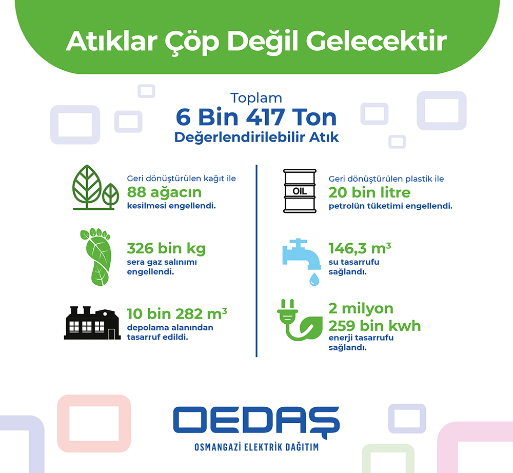 Atıkların kaynağından ayrıştırılarak milli ekonomiye kazandırılması, hammadde ve enerji tasarrufu sağlanması amacıyla çalışma alanlarında çevreci uygulamalar hayata geçiren Osmangazi EDAŞ, 6 bin 417 ton değerlendirilebilir atığı ekonomiye geri kazandırdı.
