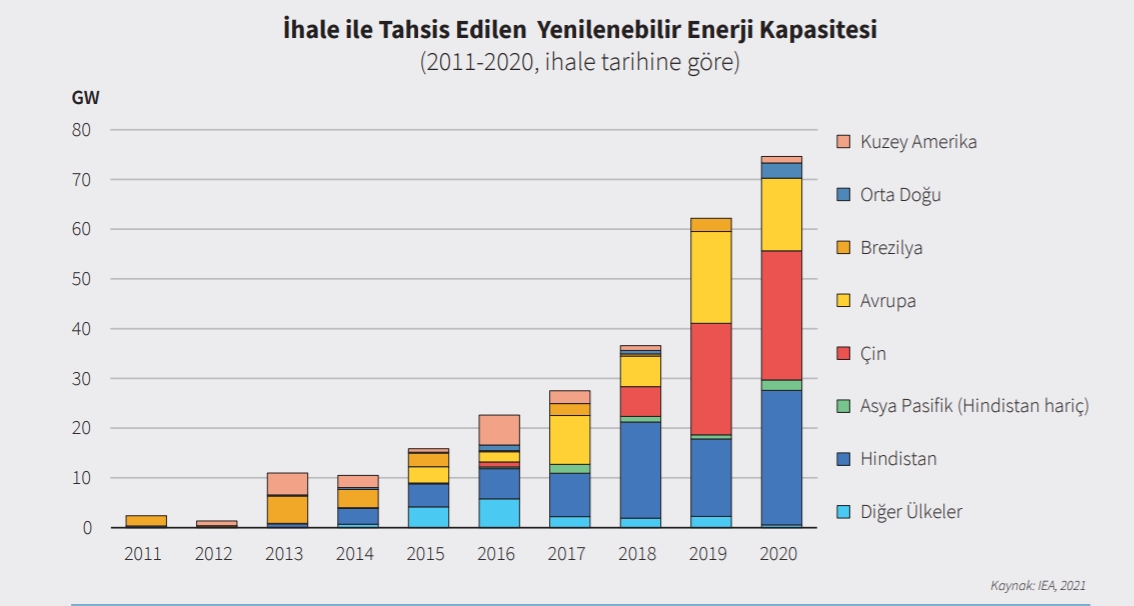 Dünya genelinde uzun vadeli yenilenebilir enerji garantili satın alma fiyatlarının ihalelerle belirlenmesi giderek yaygınlaşıyor. Yıllık 80 GW’a yaklaşan ihale hacminde, Çin, Hindistan ve Türkiye’nin de içinde yer aldığı Avrupa bölgesi başı çekiyor.