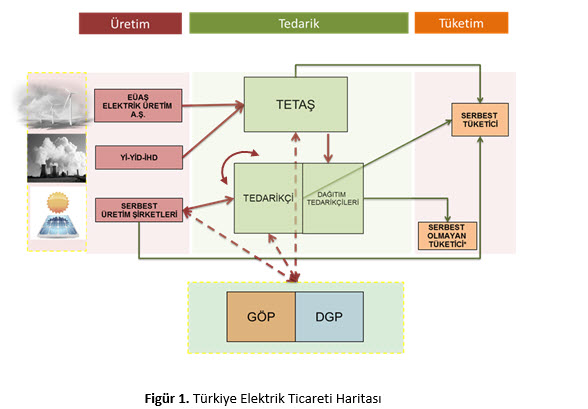 Pek çok serbest üretim şirketi aynı zamanda tedarik lisansına da sahip olup, ikili anlaşmalar ile tedarikçilerden elektrik alabileceği gibi aynı zaman gün öncesi piyasasından da elektrik temini yapabilir. Bu nedenle Figür 1’de serbest üretim şirketleri ile tedarikçiler ve gün öncesi piyası arasındaki ticaret çift yönlü oklar ile ifade edilmiştir.