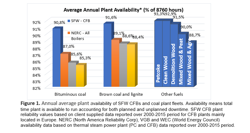 This one difference is the main reason that CFB boilers can achieve reliability levels unreachable by conventional PC boilers. Figure 1 shows average annual plant reliabilities between plants with SFW CFBs as compared to coal plant fleets in several world regions reported by multiple sources.