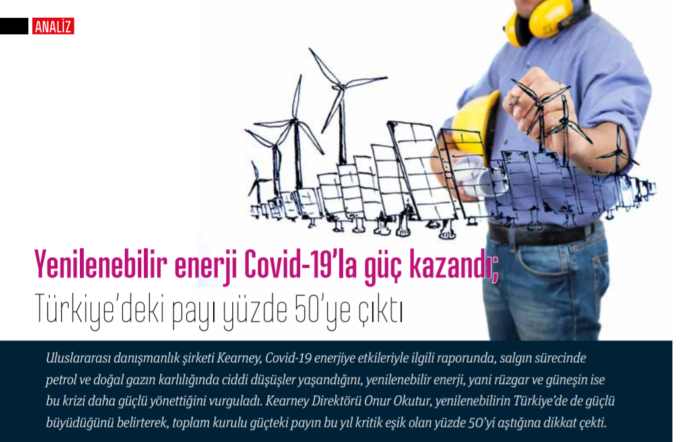 Uluslararası danışmanlık şirketi Kearney, Covid-19 enerjiye etkileriyle ilgili raporunda, salgın sürecinde petrol ve doğal gazın karlılığında ciddi düşüşler yaşandığını, yenilenebilir enerji, yani rüzgar ve güneşin ise bu krizi daha güçlü yönettiğini vurguladı. Kearney Direktörü Onur Okutur, yenilenebilirin Türkiye’de de güçlü büyüdüğünü belirterek, toplam kurulu güçteki payın bu yıl kritik eşik olan yüzde 50’yi aştığına dikkat çekti.