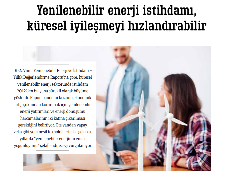 IRENA’nın ‘Yenilenebilir Enerji ve İstihdam – Yıllık Değerlendirme Raporu’na göre, küresel yenilenebilir enerji sektöründe istihdam 2012’den bu yana sürekli olarak büyüme gösterdi. Rapor, pandemi krizinin ekonomik artçı şokundan korunmak için yenilenebilir enerji yatırımları ve enerji dönüşümü harcamalarının iki katına çıkarılması gerektiğini belirtiyor. Öte yandan yapay zeka gibi yeni nesil teknolojilerin ise gelecek yıllarda “yenilenebilir enerjinin emek yoğunluğunu” şekillendireceği vurgulanıyor.